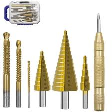 Komplet burgija omogucava bušenje metala, livenog gvožđa, obojenih metala i očvrsnute plastike. Karakteristike: Od kaljenog HSS (čelik za velike brzine) Samocentrišuci bitovi Duboka voluta za brzu evakuaciju koplja